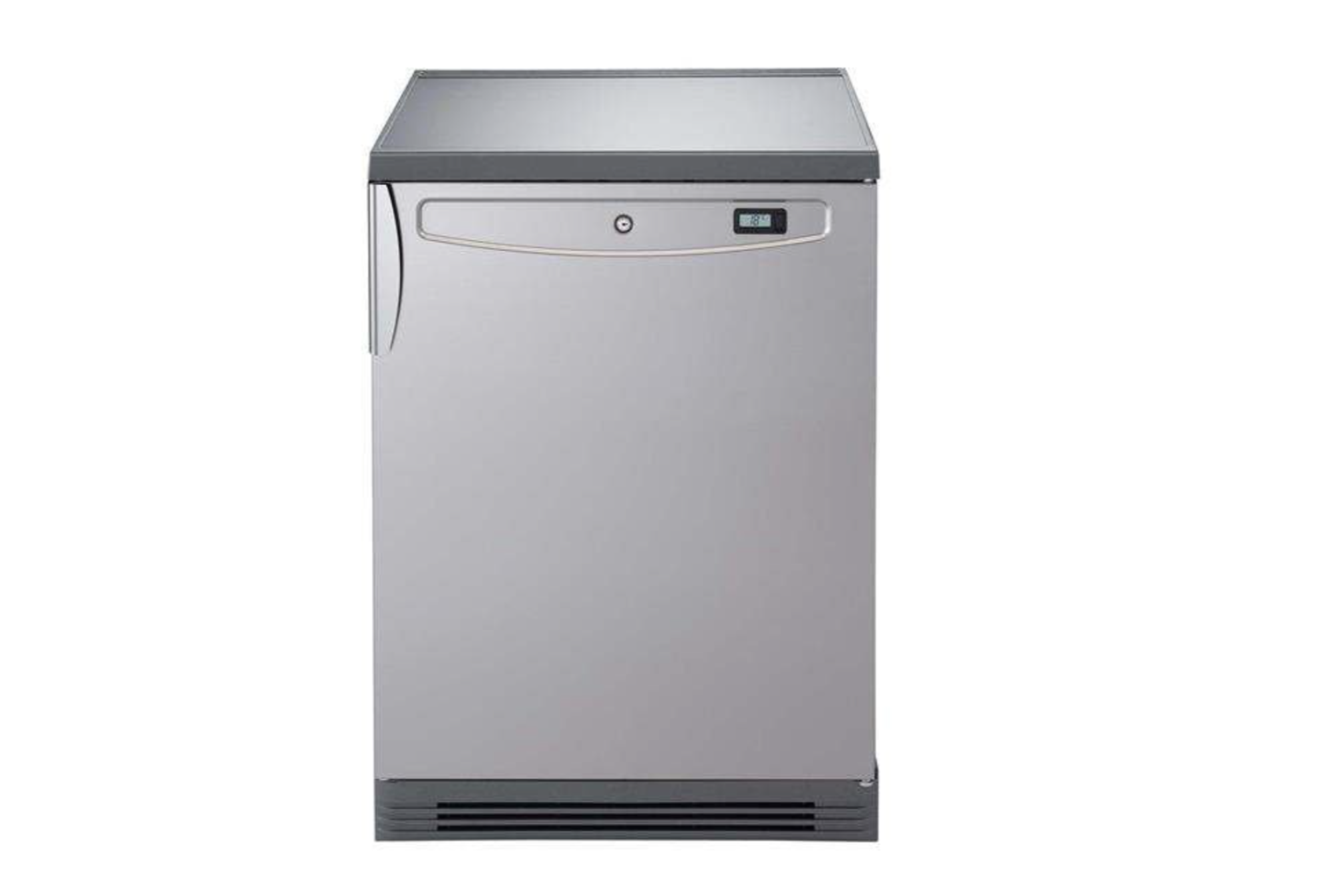 Sleek stainless steel build for longevity, easy maintenance, and professional appearance. Compact 60x58.5x85.5 cm size fits under countertops, saving valuable kitchen space. Energy-efficient operation with a low electric power consumption of 100W. Static cooling ensures uniform temperature in the 130-liter capacity for various items. Single door allows convenient access without compromising overall internal temperature.