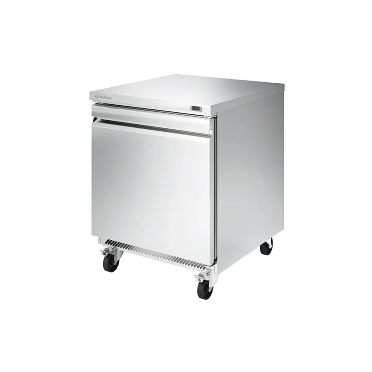 Single door undercounter freezer, One-section, Self-Cleaning Condenser, Digital temperature control & monitor system, LED interior lighting & fan control, Stainless steel exterior, AL interior with stainless steel floor, ABS door liner, (1) door with recessed handles, Field reversible hinge available, (1) PE coated wire shelves, 4″ casters, Anti-corrosion-coated evaporator, Self-contained, 6.8 cu.ft., 115v/60/1, NEMA 5-15P, 1.9 Amps, 1/3 HP, ETL-Sanitation, cETLus