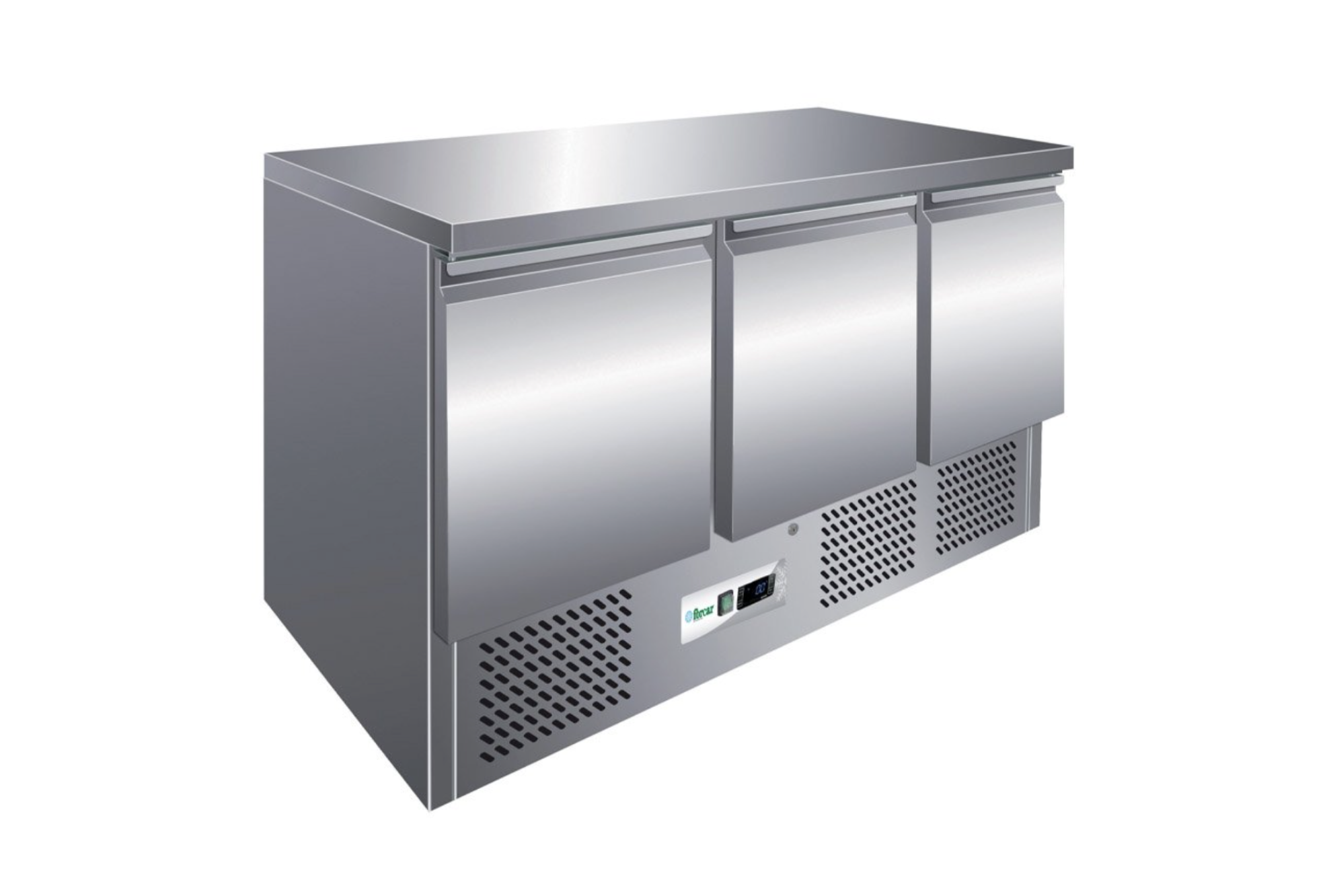 Saladette fridge refrigeration table for salads, 3 doors, stainless steel aisi201, food polyethylene worktop, automatic defrost, dimensions: 136.5 x 70 x 85 cm - 230V, 305W